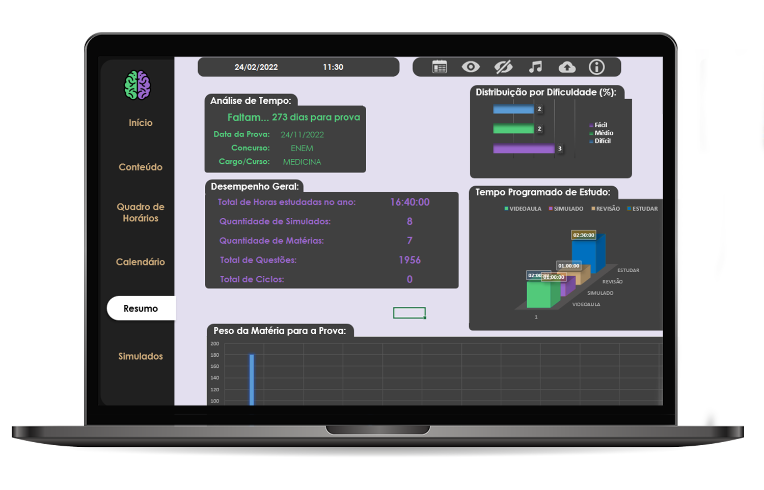 Gráficos: Tempo de estudo, pesos, desempenho geral, tempo programado, distribuição por peso e conteúdo concluído.